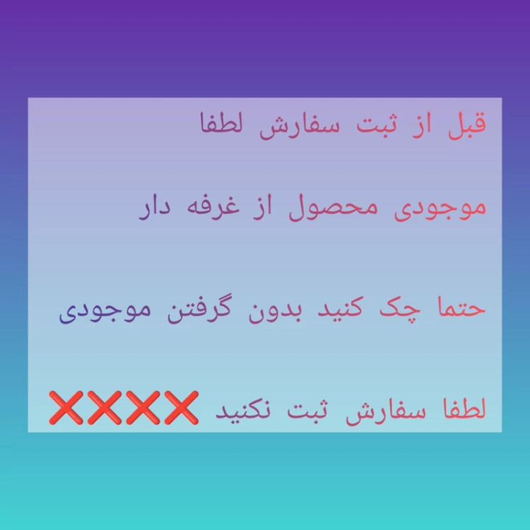 لطفاً قبل از ثبت سفارش موجودی محصول از طریق پشتیبانی سایت چک شود بدون گرفتن موجودی لطفا سفارش ثبت نکنید ۰۹۳۹۹۰۲۵۷۰۷،واتساپ ،ایتا،روبیکا،تلگرام